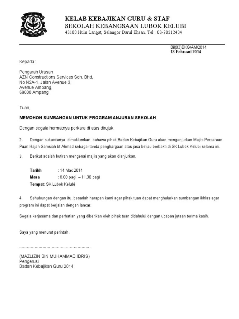 Contoh surat memohon sumbangan kewangan. Perkara paling mustahak dalam sesuatu program ialah dana. Pihak sekolah, panitia dan kelab guru biasanya akan menganjurkan pelbagai program, program tersebut adalah untuk pendidikan dan keperluan . Contoh surat mohon sumbangan keceriaan kotasurat.com via kotasurat.com. Sumbangan bagi menampung perbelanjaan untuk menjayakan program tersebut.
